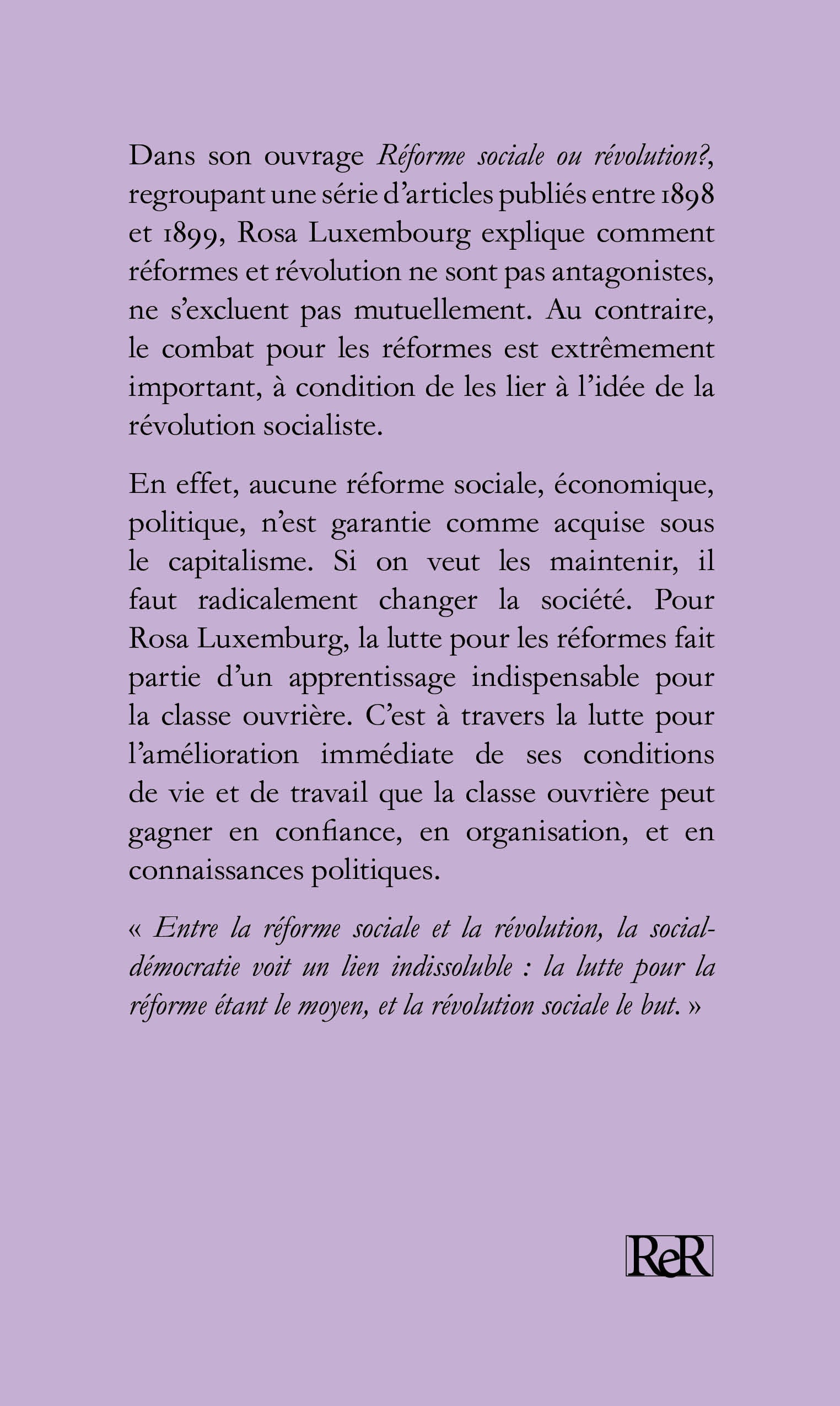 Dans son ouvrage Réforme sociale ou révolution?, regroupant une série d’articles publiés entre 1898 et 1899, Rosa Luxemburg explique comment réformes et révolution ne sont pas antagonistes, ne s’excluent pas mutuellement. Au contraire, le combat pour les réformes est extrêmement important, à condition de les lier à l’idée de la révolution socialiste.